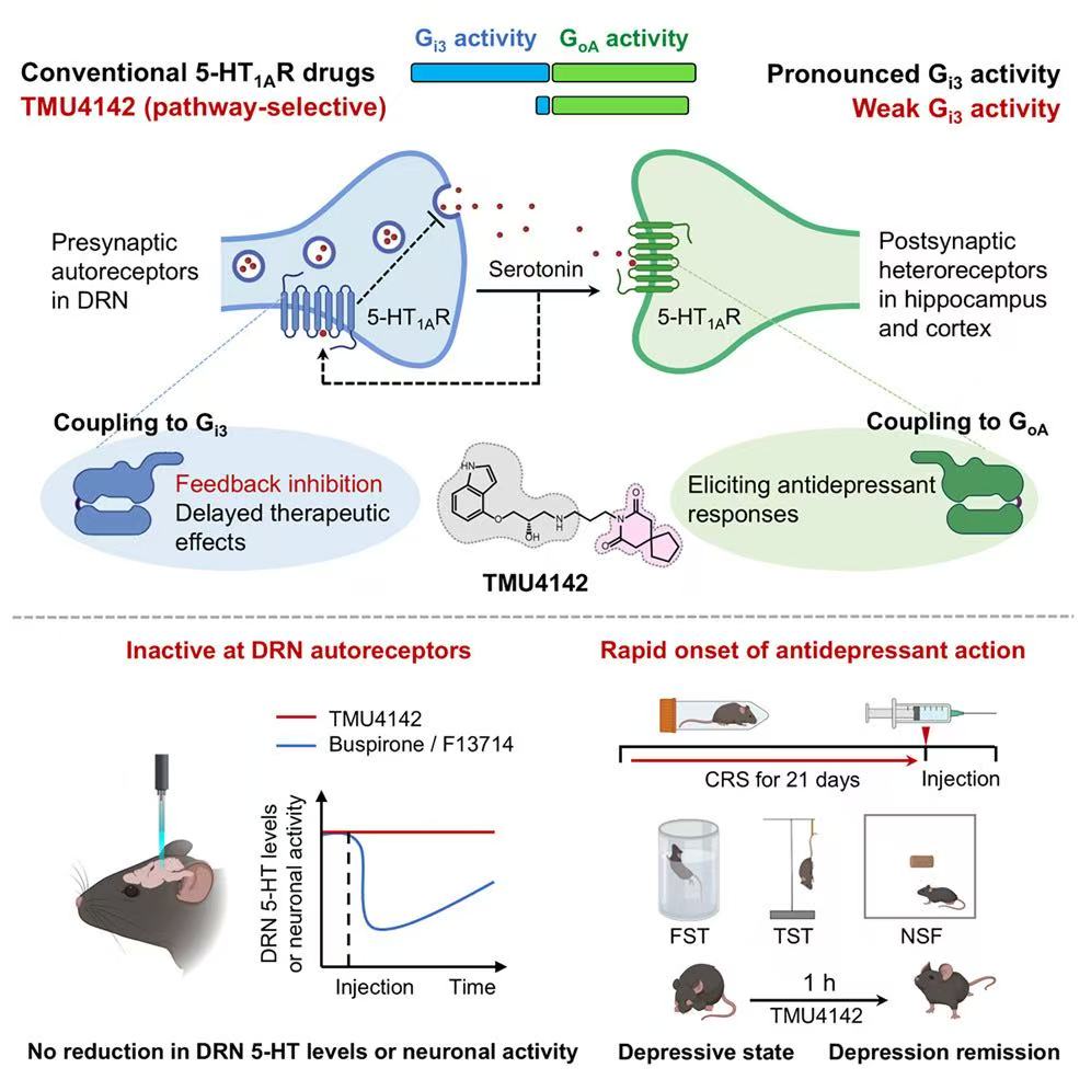 来自合肥综合性国家科学中心大健康研究院曹灿课题组与中国科学技术大学生命科学与医学部薛天课题组以及天津医科大学陈贺课题组联合研究系统剖析了 5-HT1A 受体的 Gi/o 亚型信号特征,并解析了其与六种激动剂以及三类不同 Gi/o 蛋白家族成员(GoA、Gi3 和 Gz)形成复合物的结构。结合功能分析,研究者揭示了 5-HT1A 受体多样化的激动剂识别模式及其对 Gi/o 亚型选择性的分子机制。此外,研究者设计了一个通路选择性激动剂 TMU4142,其表现出对 GoA 的高活性,同时显著减少对 Gi3 的激活。重要的是,TMU4142在小鼠抑郁模型中展现出快速抗抑郁样效果。综上,这些结果提示:基于异源受体和自受体在下游 Gi/o 信号通路上的差异进行区分,可能是一种开发快速起效抗抑郁药的有前途策略。