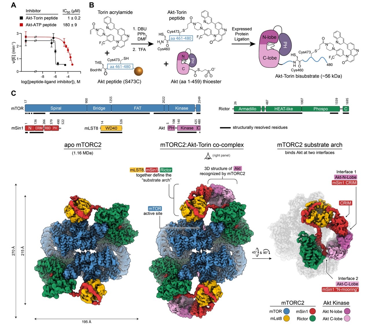 为了理解 mTORC2 如何识别其底物,来自美国波士顿布列根和妇女医院的Philip A. Cole,斯坦福大学医学院的Kacper B. Rogala以及俄亥俄州立大学综合癌症中心医学院的Nam Chu合作构建了半合成探针,用于捕获 mTORC2–Akt 复合物并解析其结构。大多数蛋白激酶通过识别磷酸化位点附近的氨基酸序列来识别底物,但对于 mTORC2 而言,局部序列对底物识别的贡献很小。相反,决定特异性的因素是 Akt 的二级和三级结构元素,这些结构在远离 mTOR 活性位点的位置与 mTORC2 组分 mSin1 结合,并且在至少 18 个相关底物中是保守的。这些结果揭示了 mTORC2 如何识别其经典底物,并可能为设计特异性针对 mTORC2 的抑制剂提供新的思路。